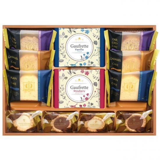●商品内容/ゴーフレットバニラ×4枚、ゴーフレットストロベリー×4枚、アールグレイケーキ×2個、キャラメルケーキ×2個、プレーンケーキ×2個、プチガトーホワイトチョコ×2個、プチガトーミルクチョコ×2個