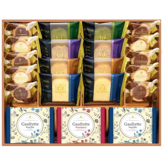●商品内容/ゴーフレットバニラ×10枚、ゴーフレットストロベリー×5枚、抹茶ケーキ×2個、アールグレイケーキ×2個、キャラメルケーキ×2個、プレーンケーキ×2個、プチガトーミルクチョコ×6個、プチガトーホワイトチョコ×4個