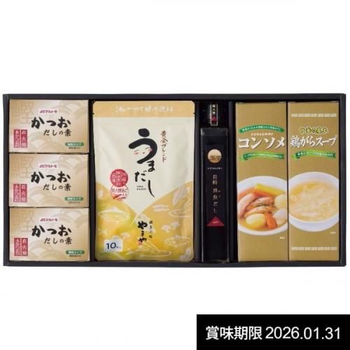●商品内容/やまやうまだし(8g×10包)×1袋、マルトモかつおだしの素(4g×4袋)×3箱、長崎飛魚だし(200ml)×1本、コンソメ(5g×10袋)・鶏がらスープ(5g×10袋)×各1箱
